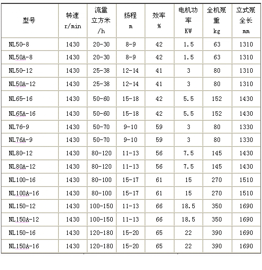 叶轮为三片单园弦弯叶,选用半封闭叶轮,并采用可锻铸铁、所以强度高,耐腐蚀;加工方便,通过性好,效率高。 为了减轻重量和减少车削量、泵轴是优质碳素钢冷拉园钢制造。 泵座中装有四只骨架油封和轴套,防止轴磨损,延长轴的使用寿命。 本泵可垂直或倾斜使用,占地面积小,蜗壳需埋在工作介质中工作,容易启动,不需弓I水,旋转方向应从电机尾部看是顺时针方向工作。 总机长度备有各种规格,以便使用单位根据用途因地制宜地选用。二、NL型污水泥浆泵主要用途: