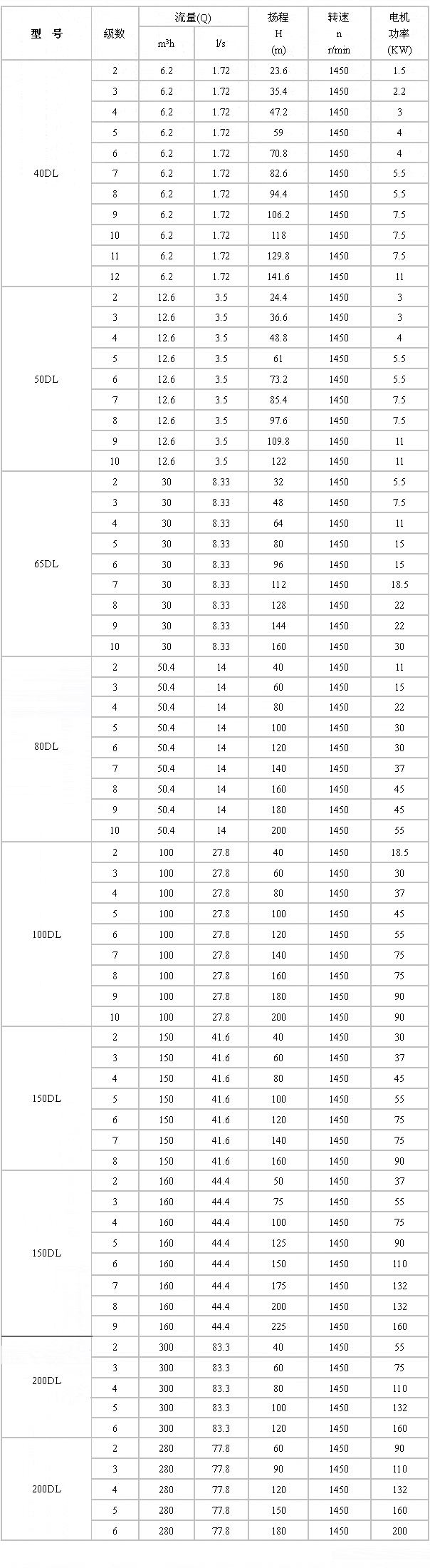 六、DL立式多级离心泵性能参数:
